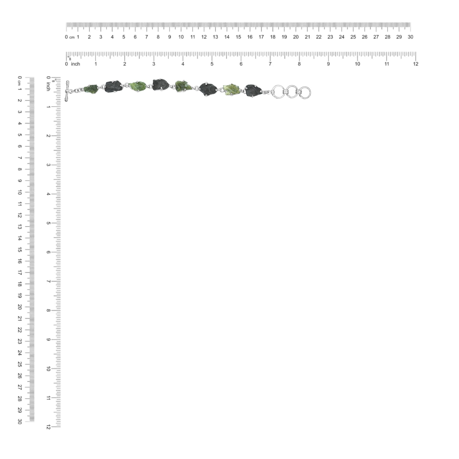 - This 925 fine Sterling Silver bracelet features 4 pieces of Moldavite and 4 pieces of Agoudal Iron Meteorite in handcrafted prong settings with single chain links between each stone and 3 toggles for a perfect fit. Easily adjusts to sizes 7.25 inch, 7.75 inch, and 8.25 inch.