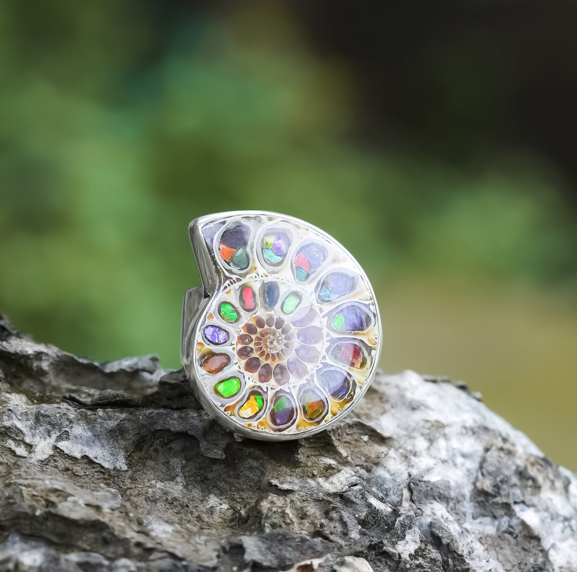 - This unique Ring features radiant Ammonite shell meticulously inlaid by hand into the chambers of a genuine fossilized Ammonite.