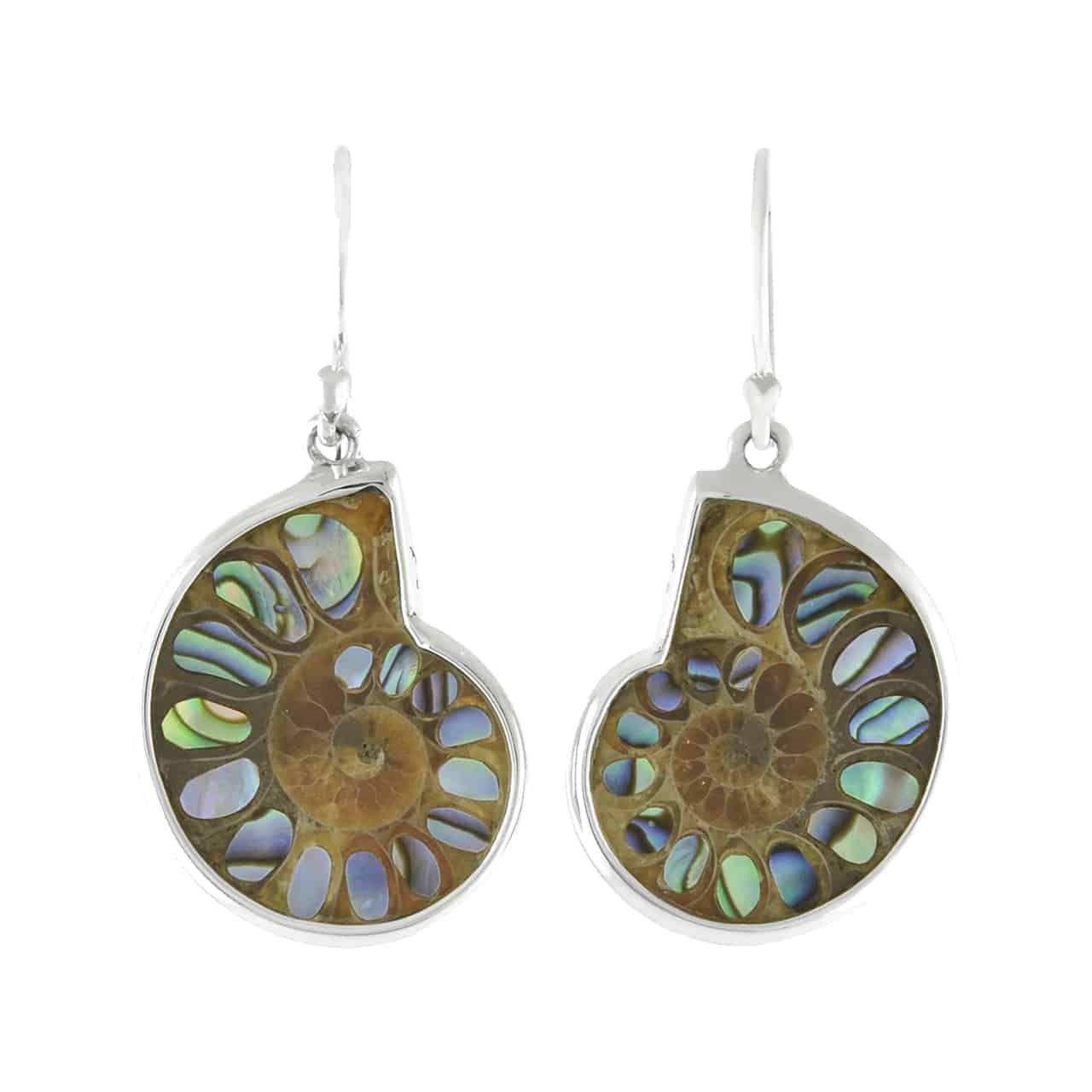 - Each pair of earrings features radiant Abalone shell meticulously inlaid by hand into the chambers of genuine fossilized ammonite.