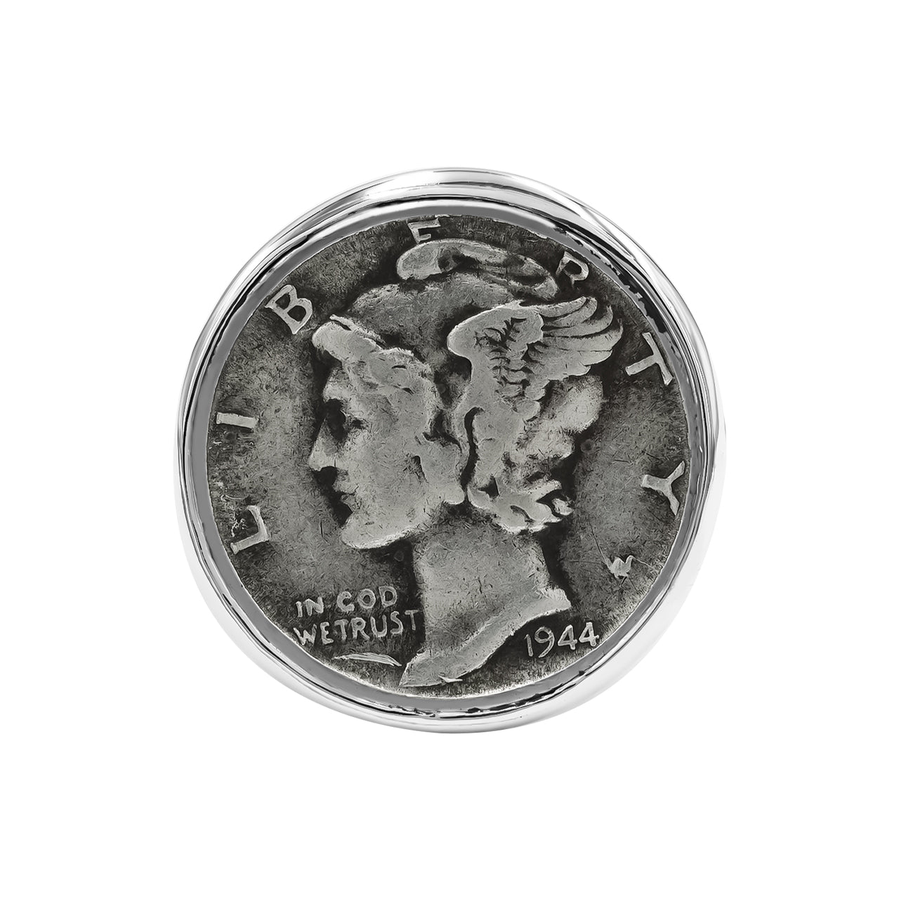 - Authentic Mercury Dime Coin ring expertly handcrafted in Fine Sterling Silver. The coin is securely set in a half-round bezel with a fixed sturdy shank, creating a vintage charm meets modern elegance that adds a subtle yet powerful dimension to your fashion statement.