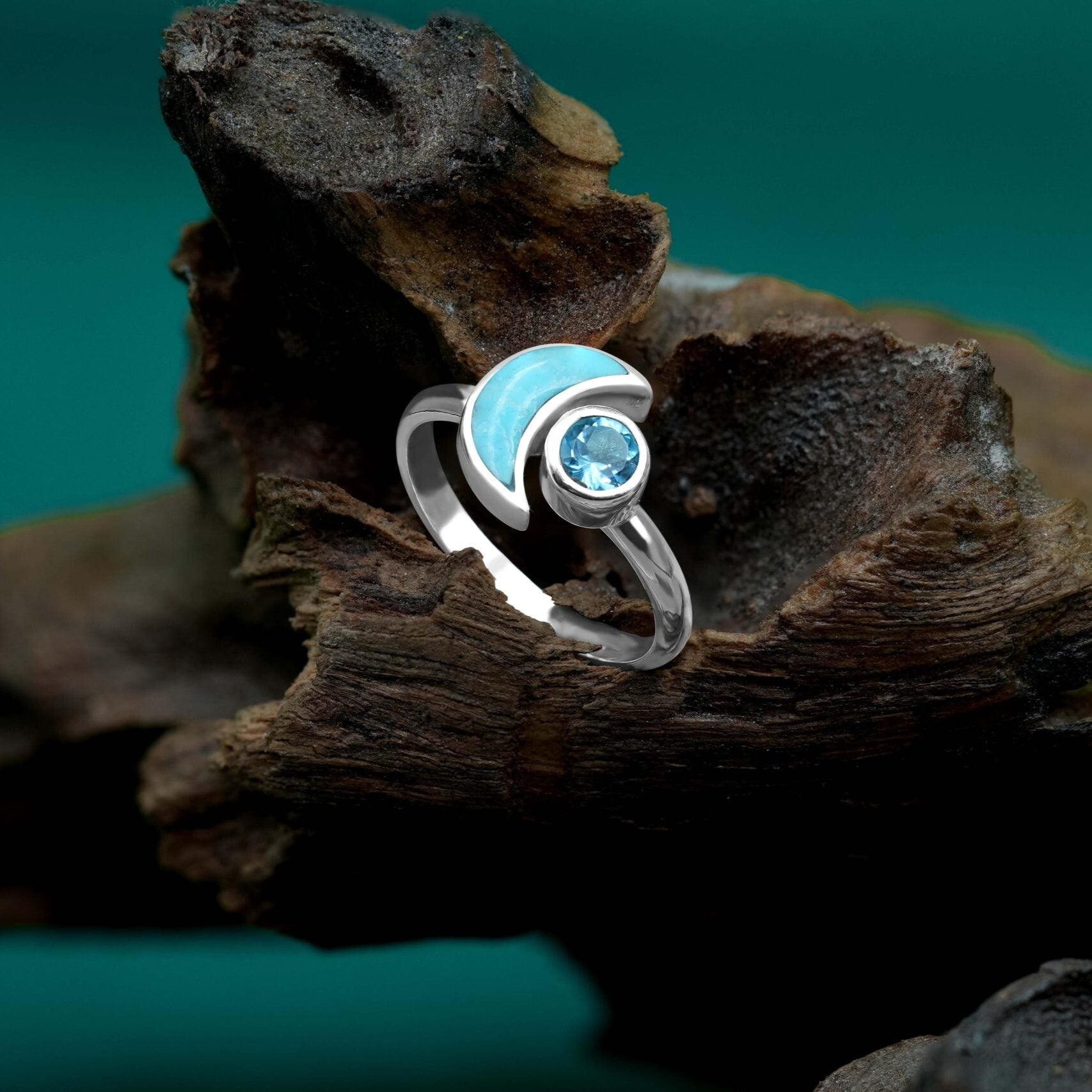 - Captivating Turquoise and Blue Topaz ring handcrafted in Fine Sterling Silver. This attractive ring features a 10 mm crescent moon Turquoise combined with a 5 mm round faceted Blue Topaz in a bezel setting with a dainty band and smooth minimalist style shank for timeless beauty.